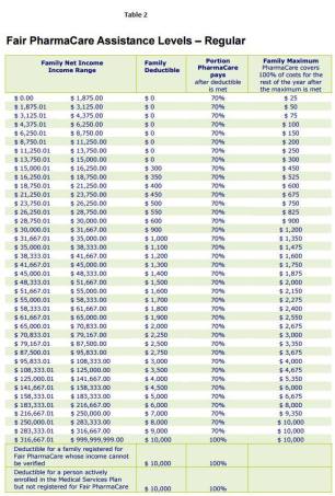 Family Maximum: The family maximum protects you (and, if applicable, your family) from high expenses. If your contributions towards eligible costs reach this amount, PharmaCare pays 100% of your eligible costs for the rest of the year (family maximum also depends on your family net income – Table 2)